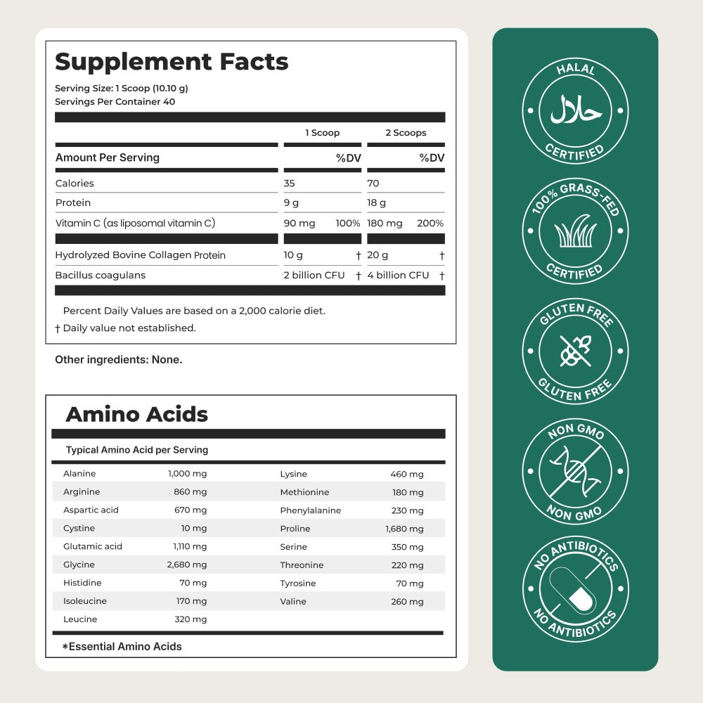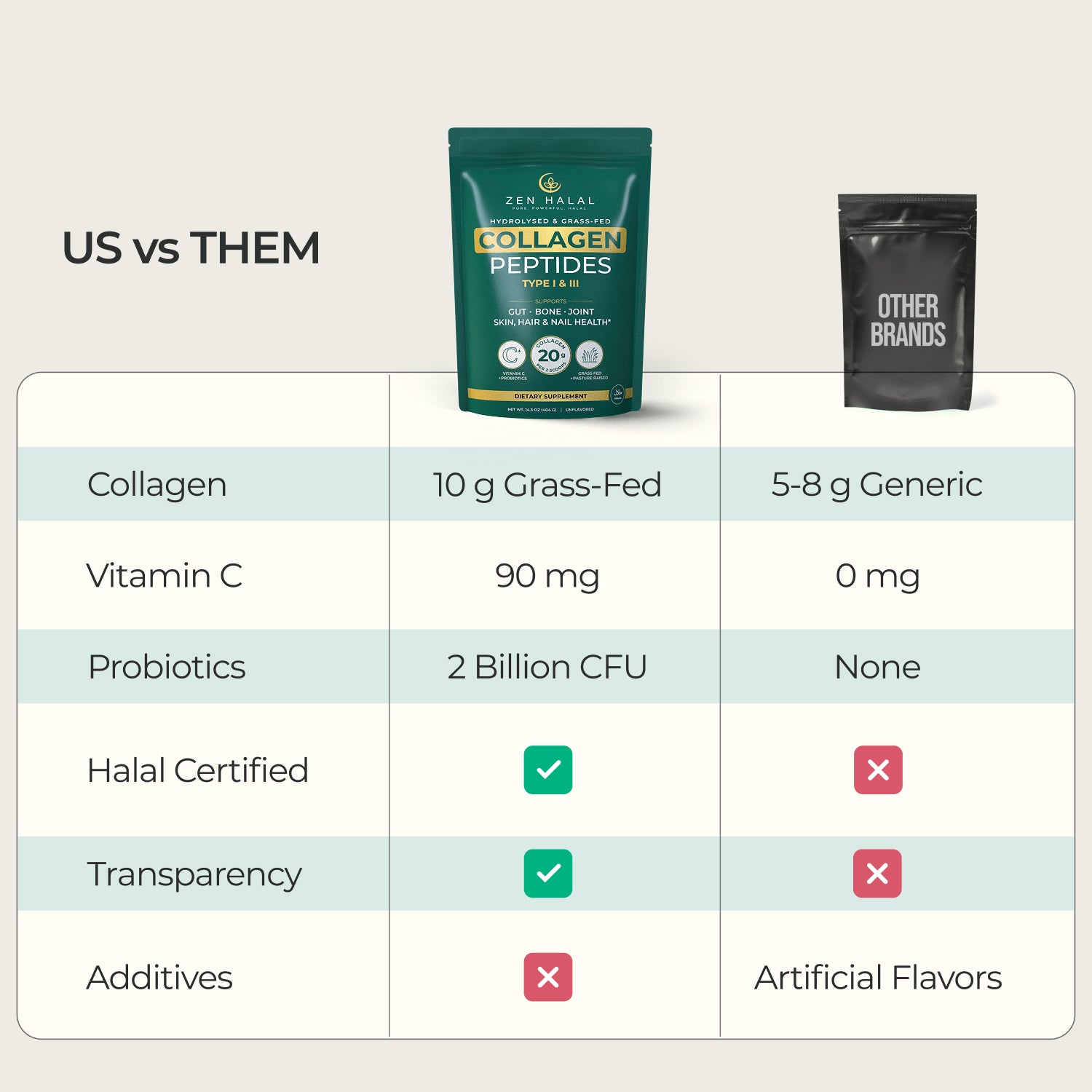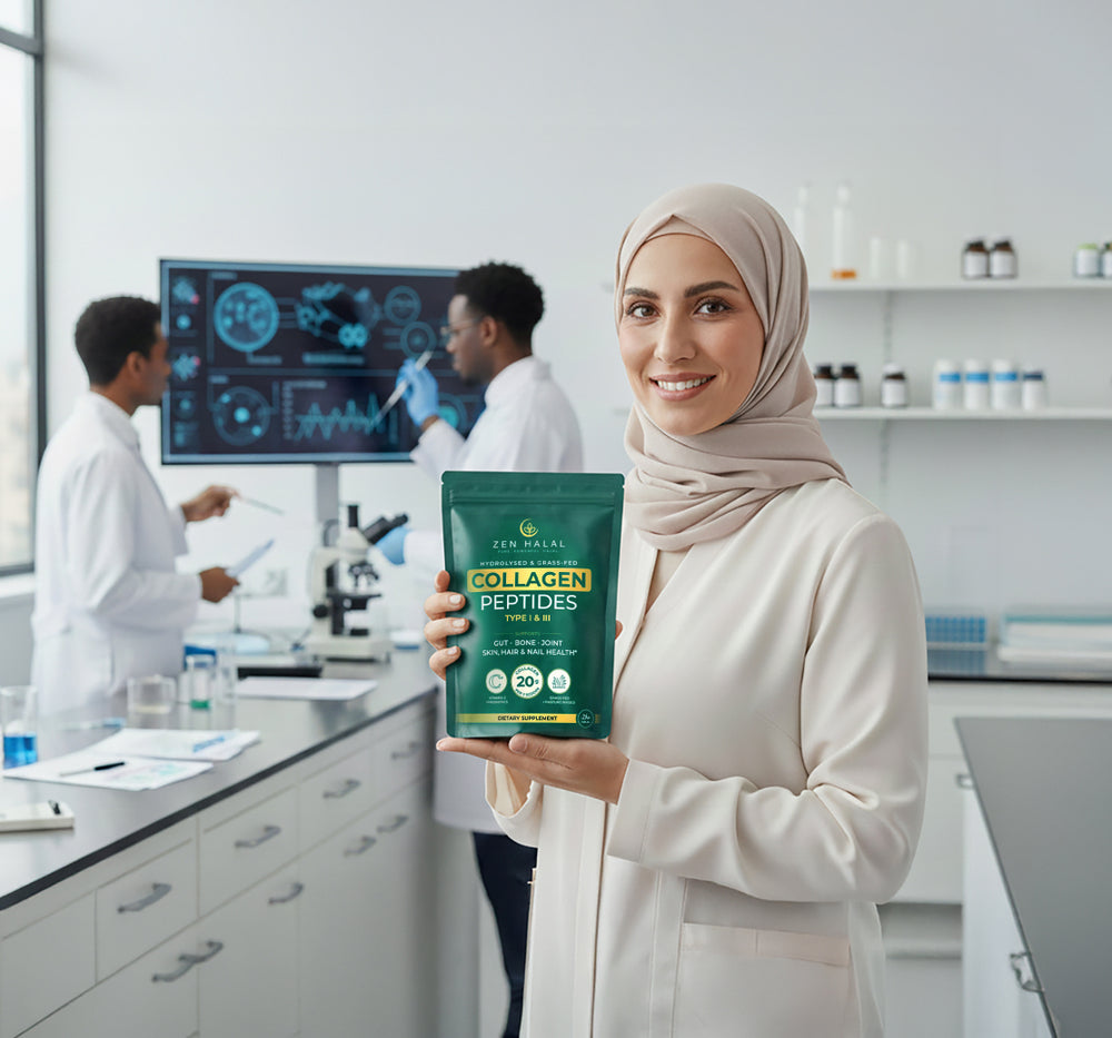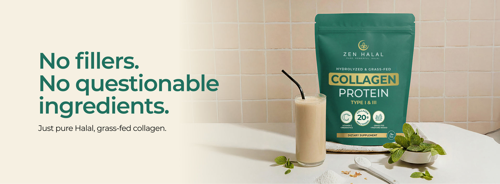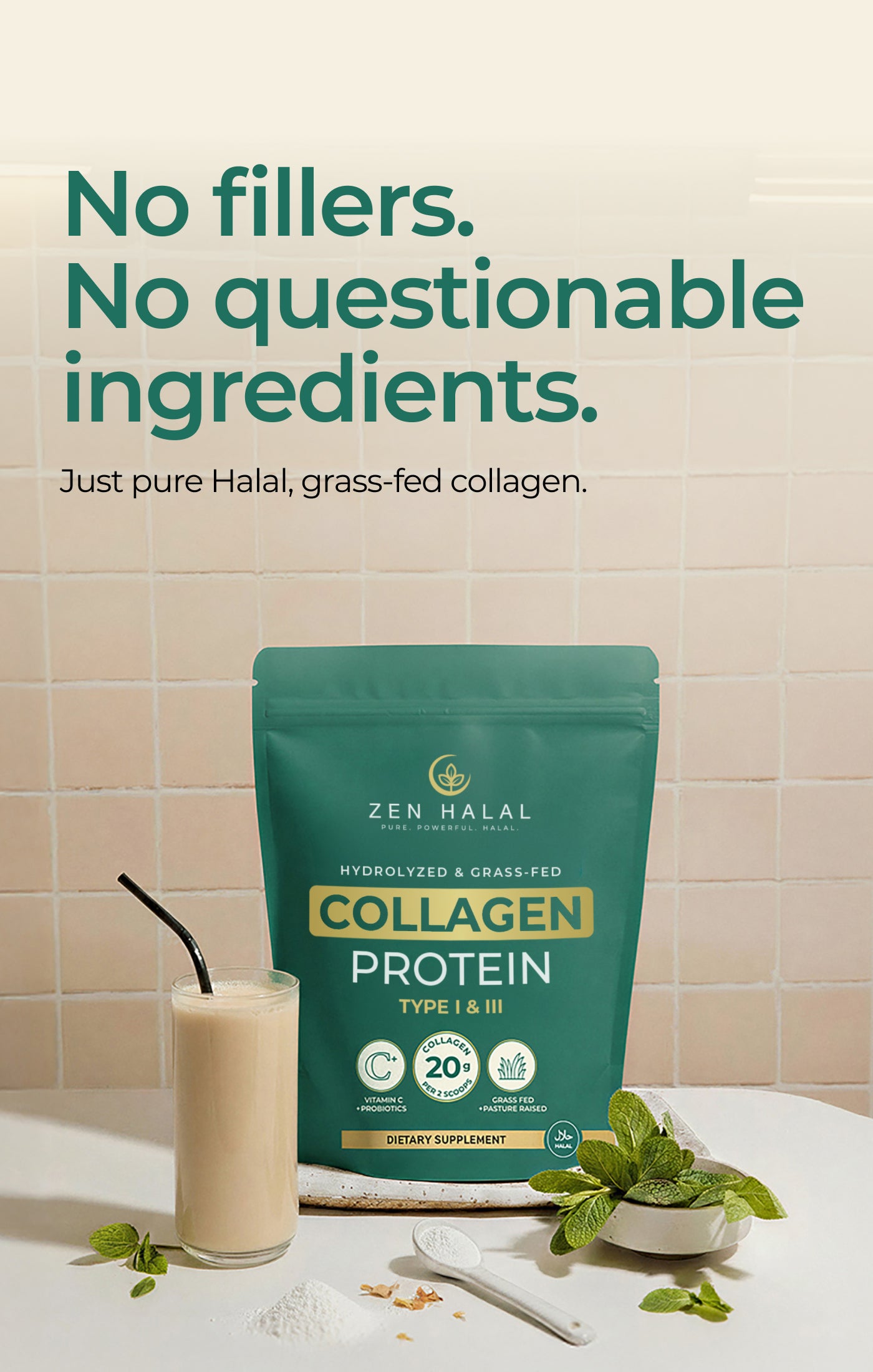 Zen Halal Collagen is halal-certified, grass-fed, and intentionally simple. Hydrolyzed collagen with Vitamin C and a probiotic, with no fillers or artificial additives. We also provide transparent labeling and accessible quality documentation.