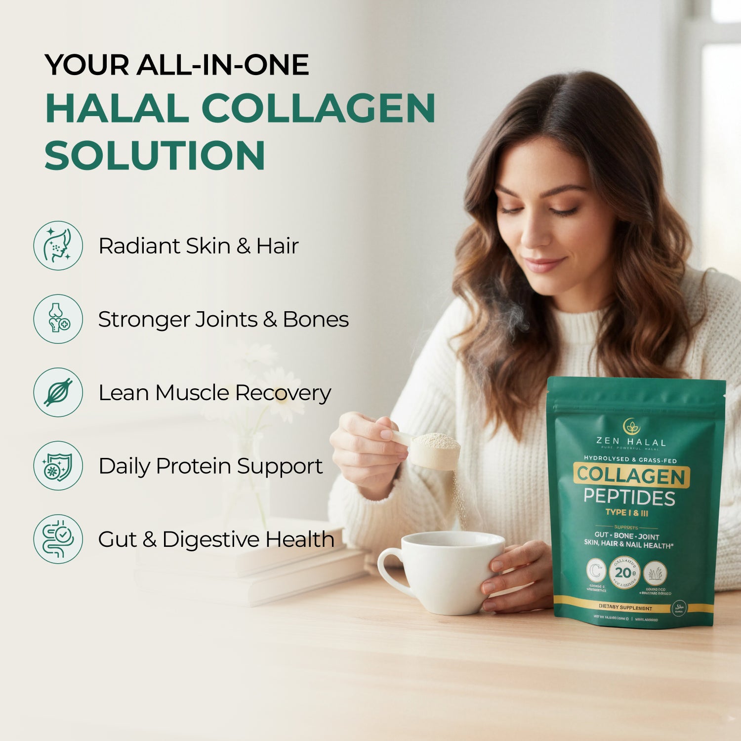 Zen Halal Collagen is a halal-certified, grass-fed bovine collagen powder Type I and III with Vitamin C and a probiotic. It is unflavored and designed for easy daily use.